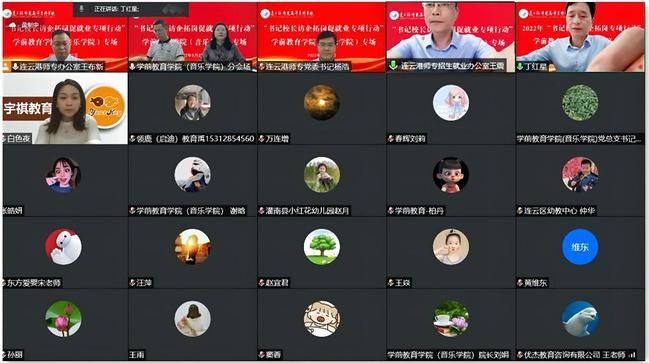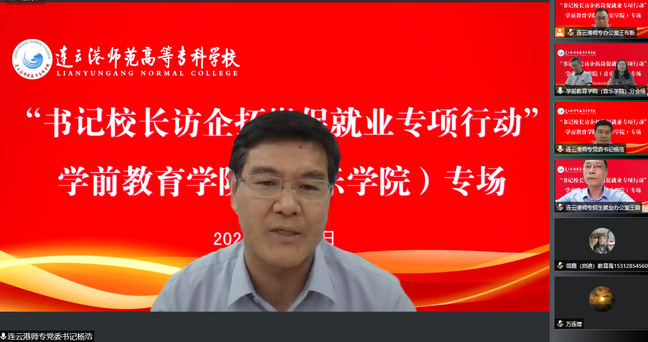 为贯彻落实国家和省关于高校毕业生就业工作的决策部署,千方百计为毕业生开拓更多就业创业岗位和机会,深入落实就业工作“一把手”工程,5月22日,我校举行“书记校长访企拓岗促就业专项行动”学前教育学院(音乐学院)专场交流会。校党委书记杨浩,副校长丁红星,党委办公室主任王布新,招生就业办公室主任王震及学前教育学院(音乐学院)领导班子成员,与北京优杰教育咨询有限公司、苏州市吴中区木渎小星星幼儿园、江苏领鹿教育科技有限公司、连云港市春辉教育有限公司等十余家用人单位负责人进行了视频交流。交流会由王震主持。