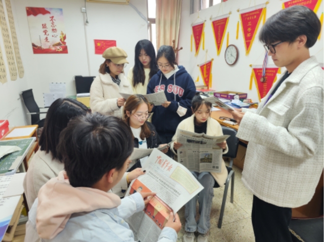 校团委以校学生会、社团临时团支部、青年学习社以及各思政类社团为学习载体,充分发挥各级团学组织的政治功能,开展“团员青年读学党报”系列活动,利用校广播台、党团工作站、团委官微等学习阵地,通过“我来读党报”主题团日、“和校园主播一起读党报”、“我读党报给你听”等青年喜闻乐见的形式,带领团员青年“读党报、听党话、跟党走”,在“悦”读中学思践悟,坚定理想信念;学前教育学院(音乐学院)采取“党建+团建”的形式,通过线上+线下、自学与研讨相结合,登录“人民网+”客户端搜索专题观看每周读报,学习知识、总结心得、交流感悟;海洋港口学院学生党支部书记和辅导员走进学生宿舍开展“悦读伴我成长”教师领读领学活动,引导学生聆听党的声音,紧跟党的脚步,争做党的合格后备军;文学院组织学生认真阅读《人民日报》《中国青年报》等报刊上的新闻,学习党的二十大报告提出的新思想新论断,深刻领悟每一篇文章的精髓要义;数学与信息工程学院开展“主编带你读党报”视频学习教育,围绕当前时事热点及青年大学生关注的问题进行学习讨论。