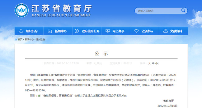 自比赛通知发布以来,学校通过多种方式广泛宣传,在校内开展征文选拔比赛,积极发动学生参与,共征集到六个学院50余篇作品,经过校内选拔、专家审定以及指导教师精心辅导等环节,推荐3篇征文作品参加江苏省大学生征文比赛。