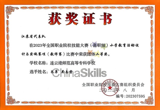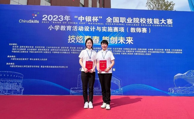 8月23日至26日,由教育部、国家发展改革委等35个部门共同主办,内蒙古自治区教育厅、鄂尔多斯市人民政府承办的2023年全国职业院校技能大赛高职组小学教育活动设计与实施赛项(教师赛)在内蒙古民族幼儿师范高等专科学校举行。本次比赛共有来自全国45支参赛队的90名选手同台竞技,我校参赛队作为江苏省2支代表队之一参加比赛。通过激烈角逐,我校朱萍、吴易霏两位教师选手在比赛中表现出色,展现了精湛的技能水平,荣获二等奖。