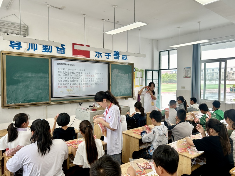 探秘非遗鱼灯,点亮传统之美。青年志愿者们在乡村小学开展非遗文化手工制作主题活动,围绕古典诗词中描写“鱼灯”的词句,详细讲解鱼灯的寓意和非遗文化的价值。在手工制作环节,志愿者们介绍了鱼灯的制作过程和注意事项。小学生们在志愿者们的辅导下,化身为“手艺人”,细心地剪裁、粘贴、装订、置灯。随着一条条五彩斑斓、活灵活现的鱼灯制作完成,小学生们体验了传统手工技艺,领略到了古人的中式浪漫和非遗民俗文化之美,进一步提升了对非物质文化遗产的参与感、获得感、认同感。
