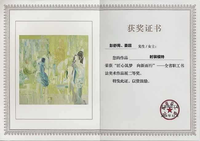 近日,美术学院姜超老师的作品《时装模特》在江苏省总工会举办的“匠心筑梦向‘新’而行”——江苏省职工书法美术作品展中荣获二等奖。