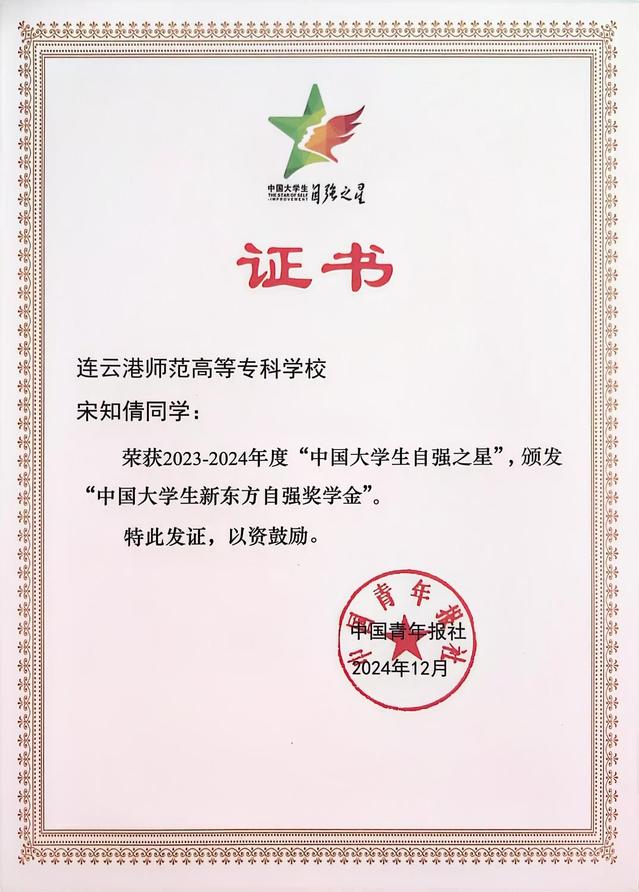 近日,由共青团中央、全国学联指导,团中央基层建设部、中国青年报社、新东方教育科技集团、中国青年创业就业基金会联合举办的2023-2024年度“中国大学生自强之星”评选结果揭晓,经学校推荐、市级审核、省级初评、全国评审等环节,我校学前教育学院(音乐学院)宋知倩同学脱颖而出,荣获“中国大学生自强之星”称号。
